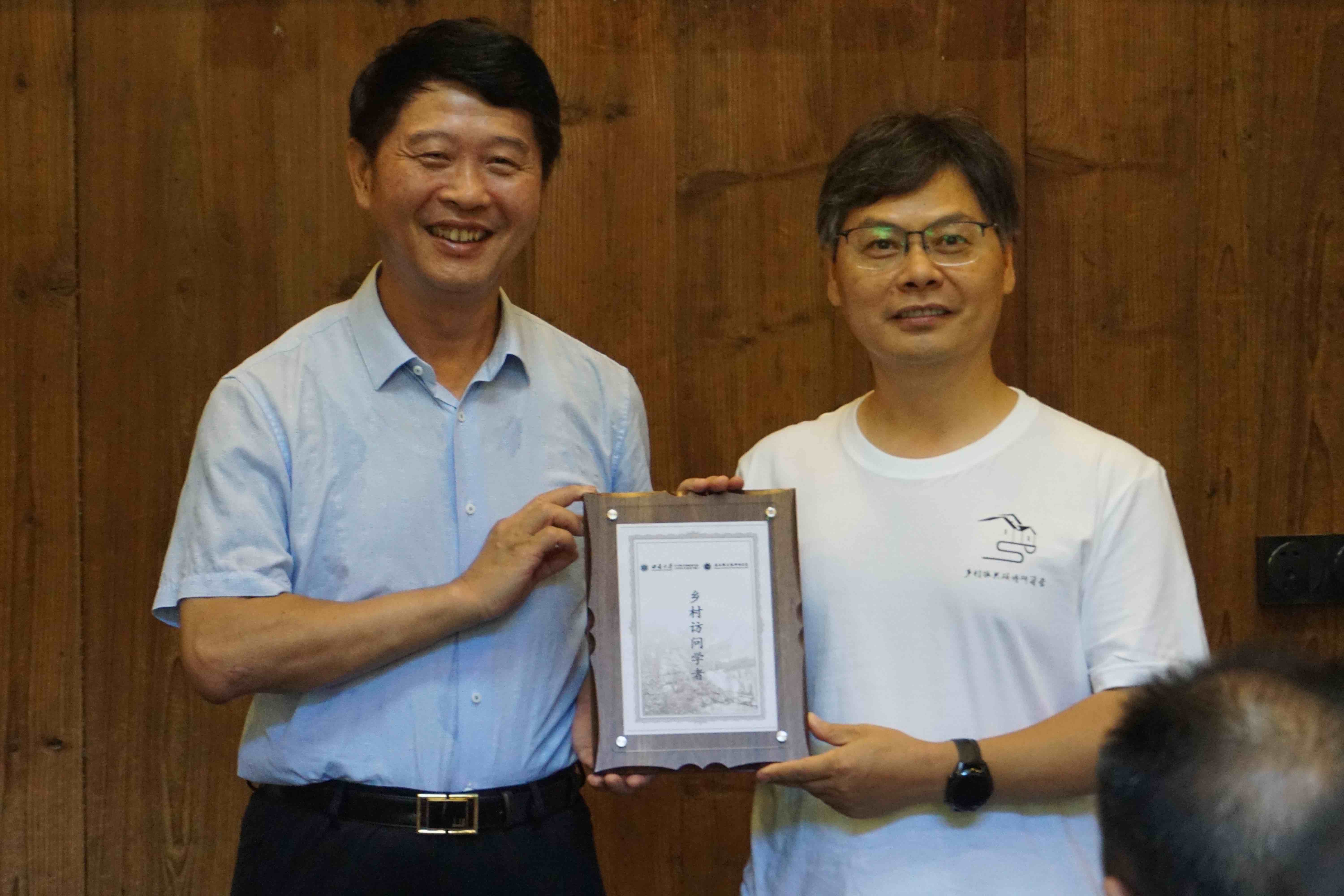 仪式上,刘宏伟主任寄语“乡建乡创天地间 用心研习促融合”,希望未来有更多的专家学者与青年学子扎根乡村,在田间沃土的滋养中促进乡村人才振兴。张德力主席介绍了屏南县通过长期的探索与实践形成的“党委政府+能人+古村+村民+互联网”的发展模式。随后,刘宏伟主任向研究院赠书,潘家恩教授回赠“温教授的一亩田”生态大米表示感谢。
