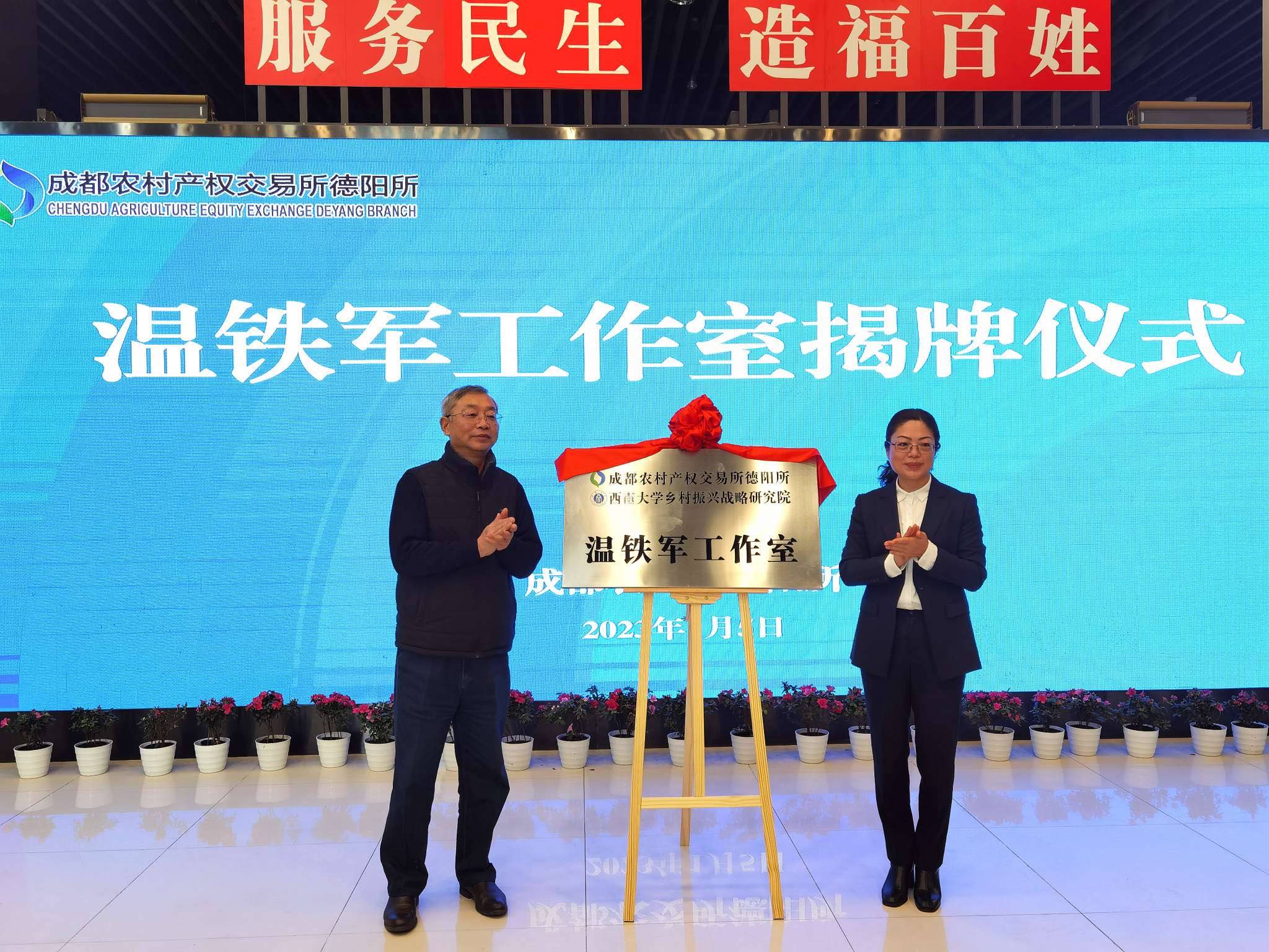 为助力乡村振兴,推动校企共建与地方服务,1月5日上午,我院与成都农村产权交易所德阳所合作共建的“温铁军工作室”揭牌仪式在四川德阳举办。我院首席专家温铁军教授进行视频发言,执行院长肖亚成教授与德阳农交所总经理谢玉萍共同为“温铁军工作室”揭牌。重庆市武隆区委副书记毛大春、德阳市农业农村局总畜牧师吴迪等一起见证了揭牌仪式。