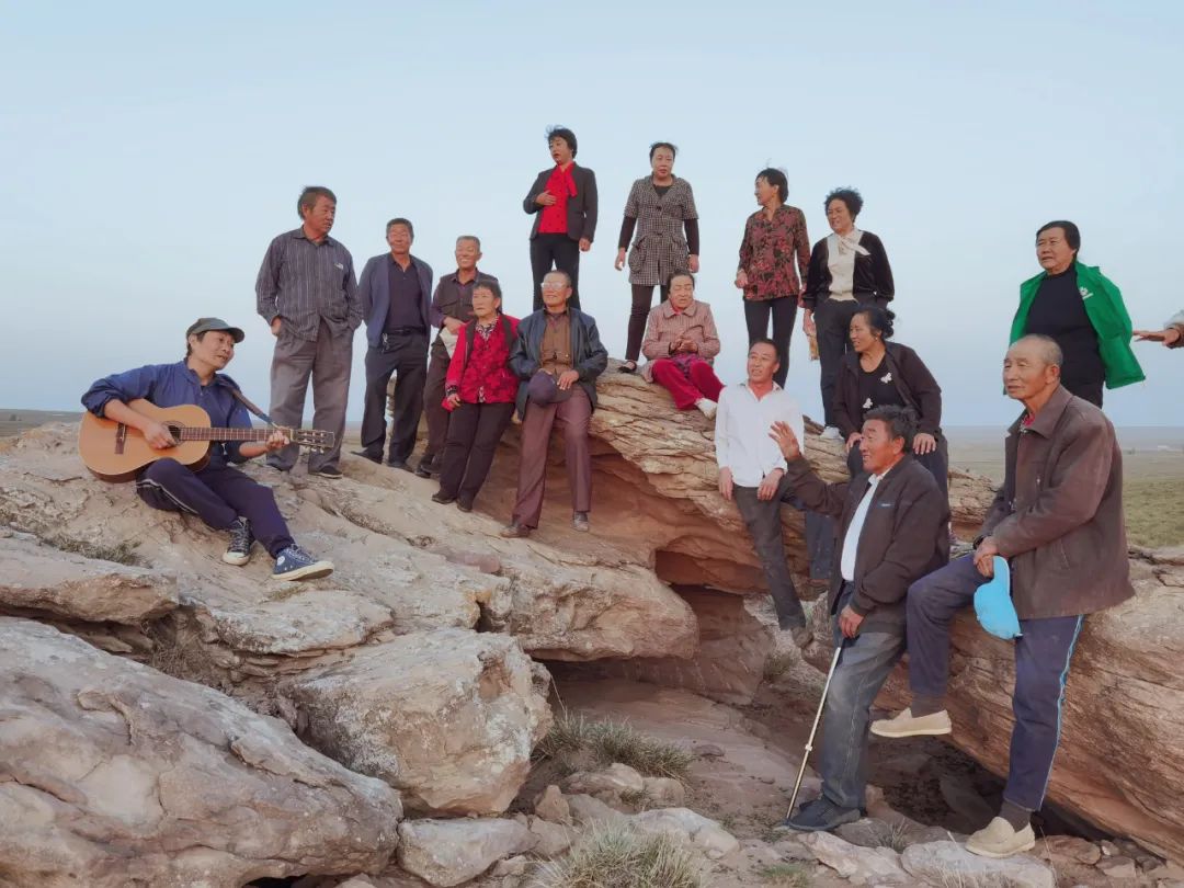孙恒(左一)和内蒙古自治区鄂托克旗木凯淖尔镇乌兰吉林村村民一起唱村歌。