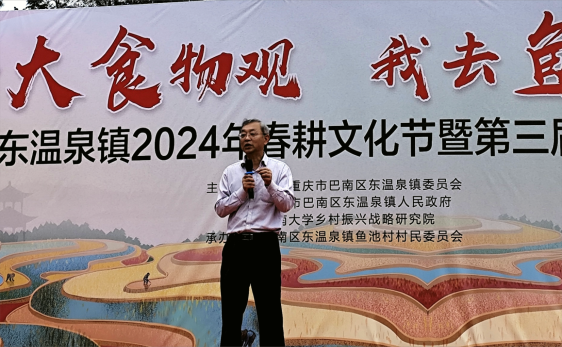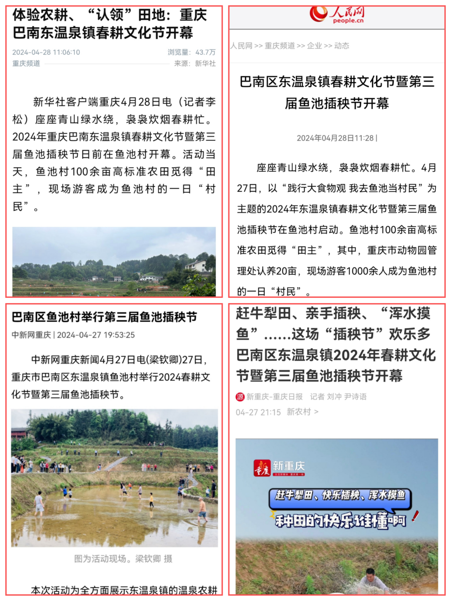 4月27日,我院执行院长肖亚成教授带队参加由我院联合主办的巴南区东温泉镇2024年春耕文化节暨第三届鱼池插秧节活动。我院潘家恩、肖青、李军、王彩虹等老师同学以及特邀研究员周鸣鸣教授和许衍主任参加了此次活动。此次活动以“践行大食物观,我去鱼池当村民”为主题,开展了“我在鱼池有块田”稻米认养、“我去鱼池当村民”农趣体验等特色活动。此次活动得到了新华社、人民网、中新网、重庆日报等多家媒体的关注报道。