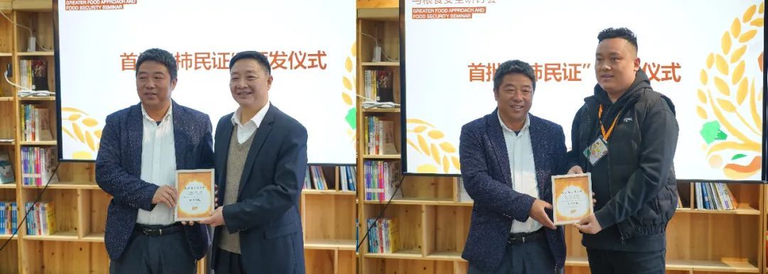 四坪村党支部书记潘家如为重庆市巴南区东温泉镇鱼池村党委书记文承军(左),四川沐云文旅董事长张俊春(右)颁发柿民证