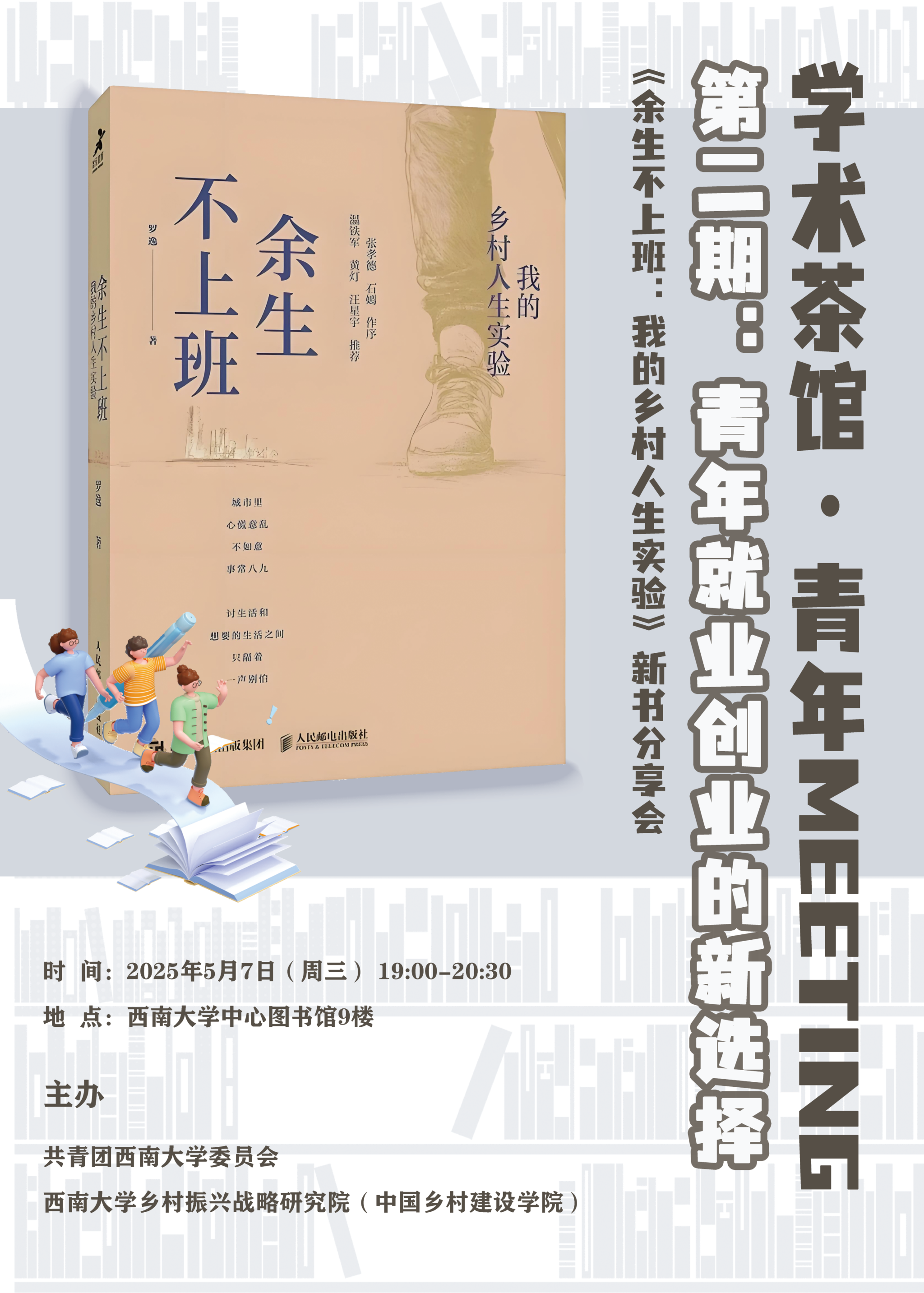 高校作为青年人才的汇聚地,肩负着培养学生多元就业创业观念的重任。本期沙龙,邀请《余生不上班》的作者和书中的两位主人公,和大家一起交流探讨,激发高校学子对就业创业的全新思考,鼓励大家突破传统思维定式,勇敢探寻属于自己的独特职业发展方向,在不同领域中实现自身价值。