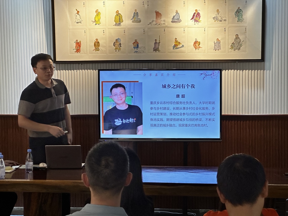 唐超以自己从“文艺青年”到“新村民”的蜕变故事出发,以自己曾经在四川省雅安市从事乡村建设工作经历,讲述了在重庆市巴南区鱼池村进行城乡互动实践,让城乡之间更充满人情味的经历。唐超的微信名叫“村口唐眼镜儿”,他在分享中介绍,“希望自己能融入村庄,成为村口的‘桥墩’,让城乡之间产生更多互动。”