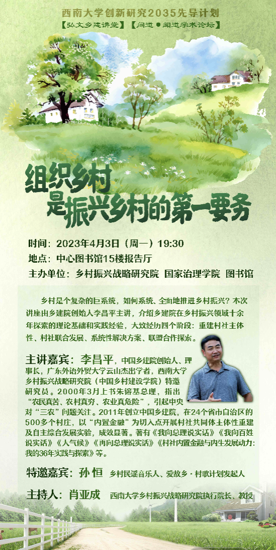 4月3日晚,我院弘文乡建讲堂第53讲在中心图书馆报告厅举行。讲座主题为“组织乡村是振兴乡村的第一要务”,由中国乡建院创始人李昌平主讲。我院执行院长肖亚成主持。此次讲座由我院与国家治理学院、图书馆共同主办。此次讲座亦为学校创新研究2035先导计划“乡村振兴的中国道路”365英国在线体育。