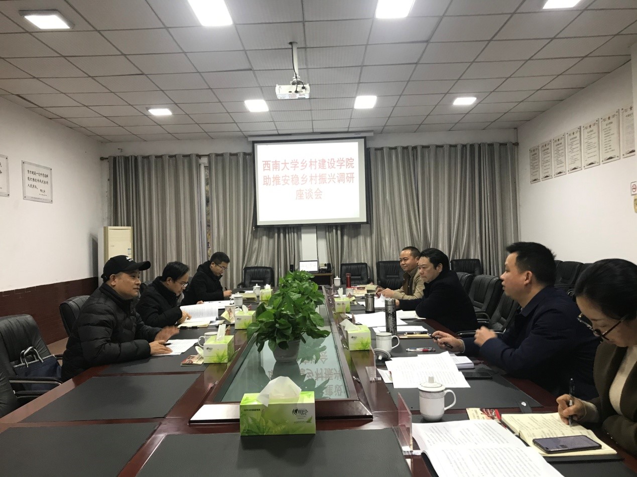 2021年11月23日,best365英国在线体育官网中国乡村建设学院执行副院长潘家恩、地方合作中心主任肖青、培训中心主任张斌、郭凌燕老师共四人赴重庆市綦江区安稳镇开展乡村振兴调研,活动结束后双方召开座谈会,就安稳镇乡村振兴的现状、未来发展及校地合作等问题进行了沟通交流。