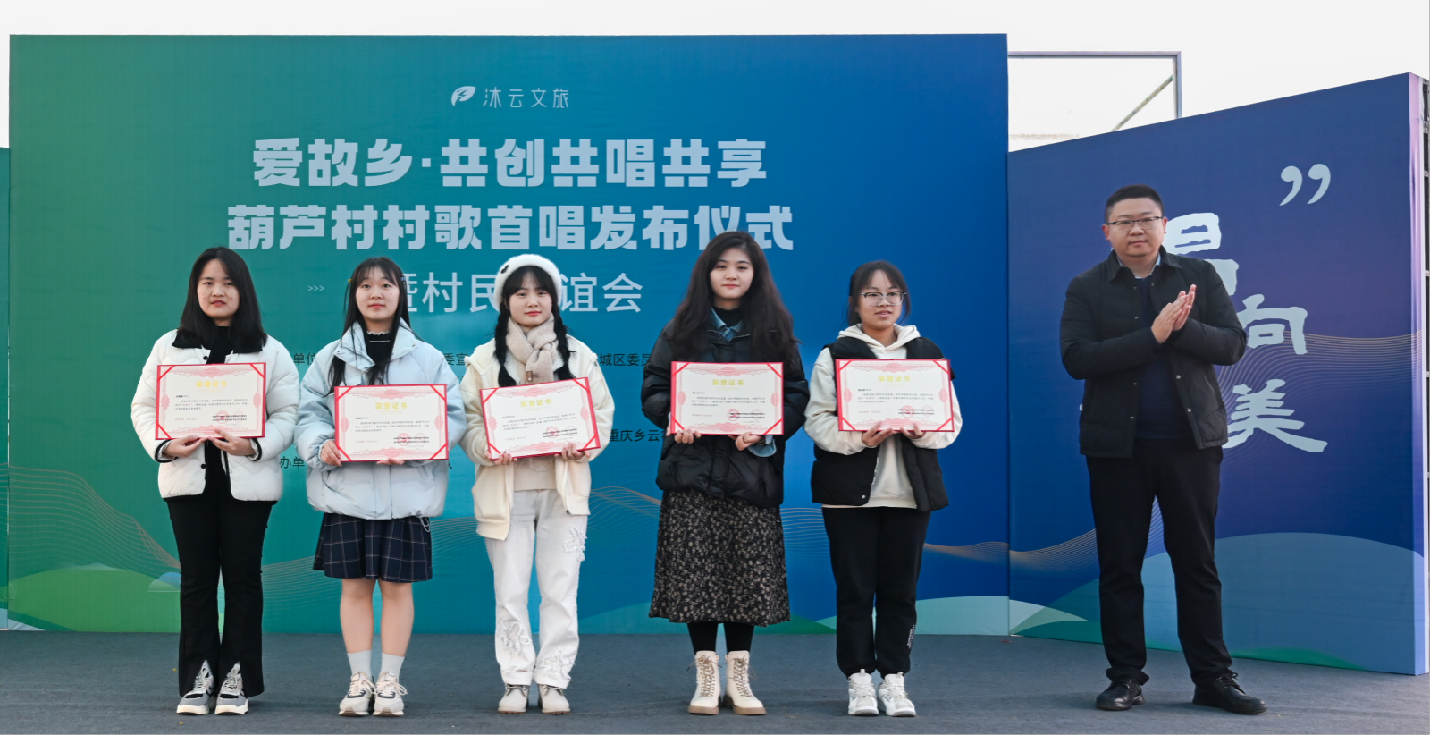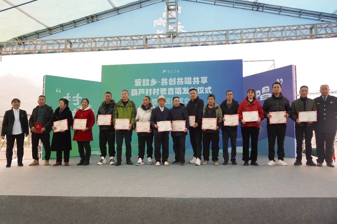 在此次村歌首唱发布仪式上,葫芦村还为此次村歌共创的主要协作者——“爱故乡·村歌计划”发起人孙恒老师以及我院指导专家等颁发了“荣誉村民”证书,为当地返乡创业青年张俊春等10多位新乡贤颁发了“新乡贤”证书,为四川农业大学社会工作专业志愿者们颁发了“葫芦村新青年团队”证书等。