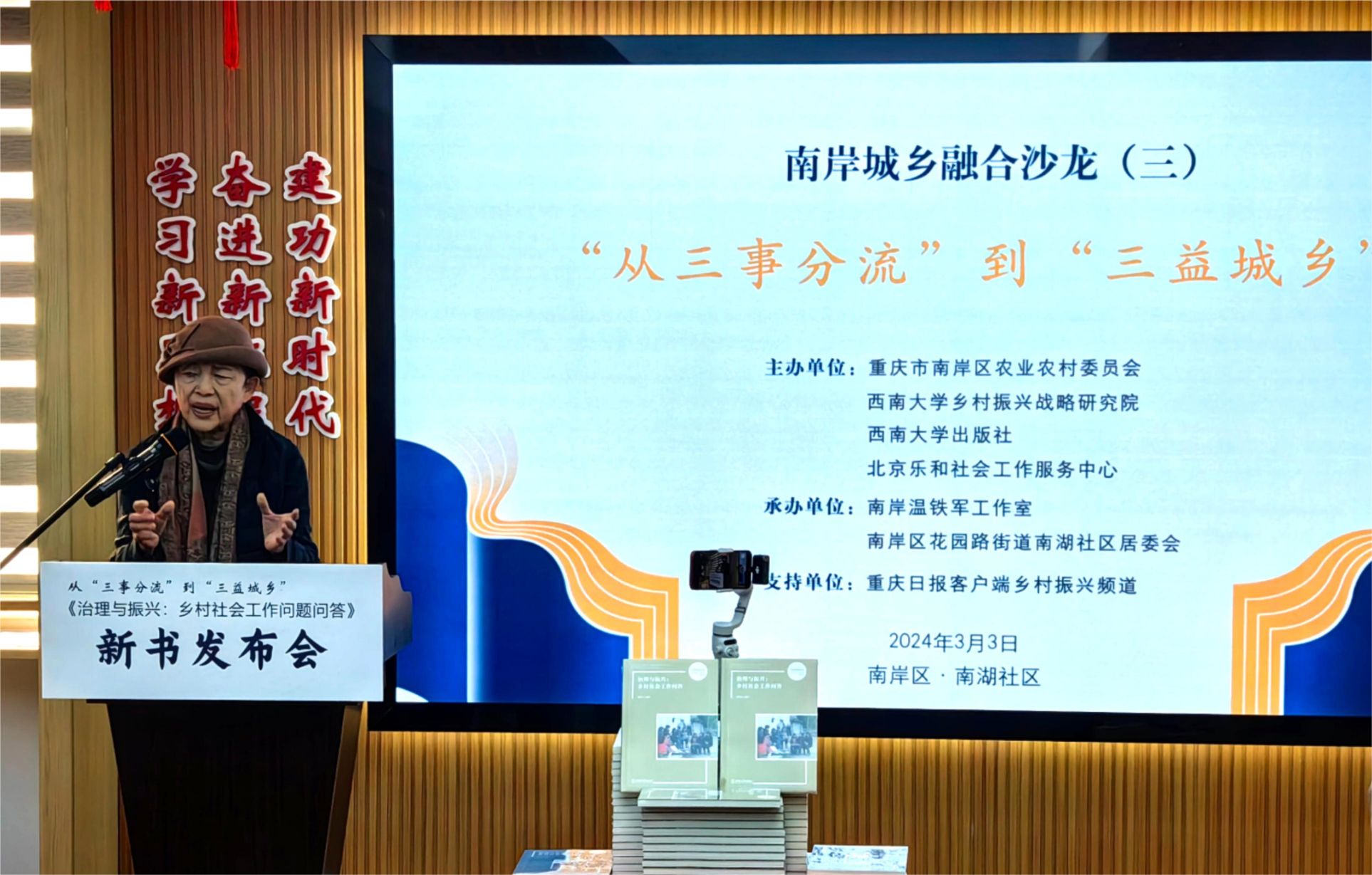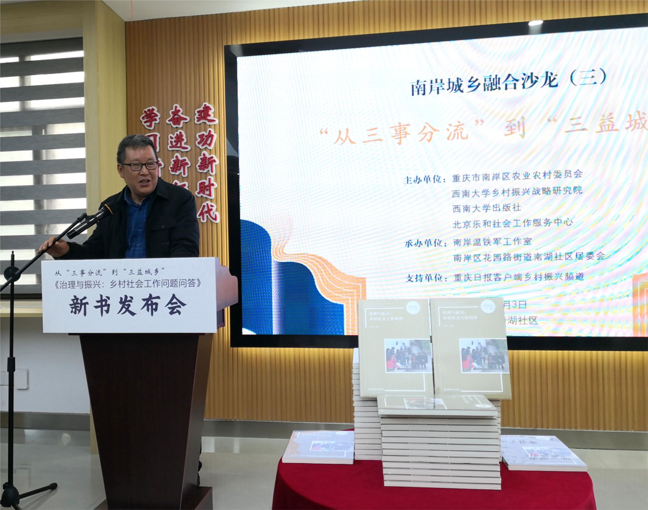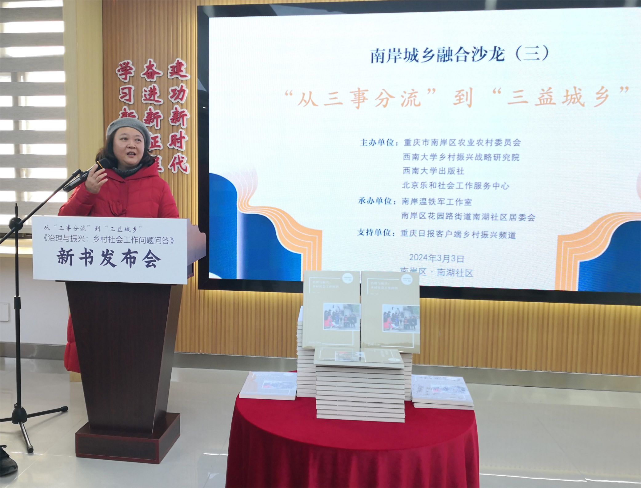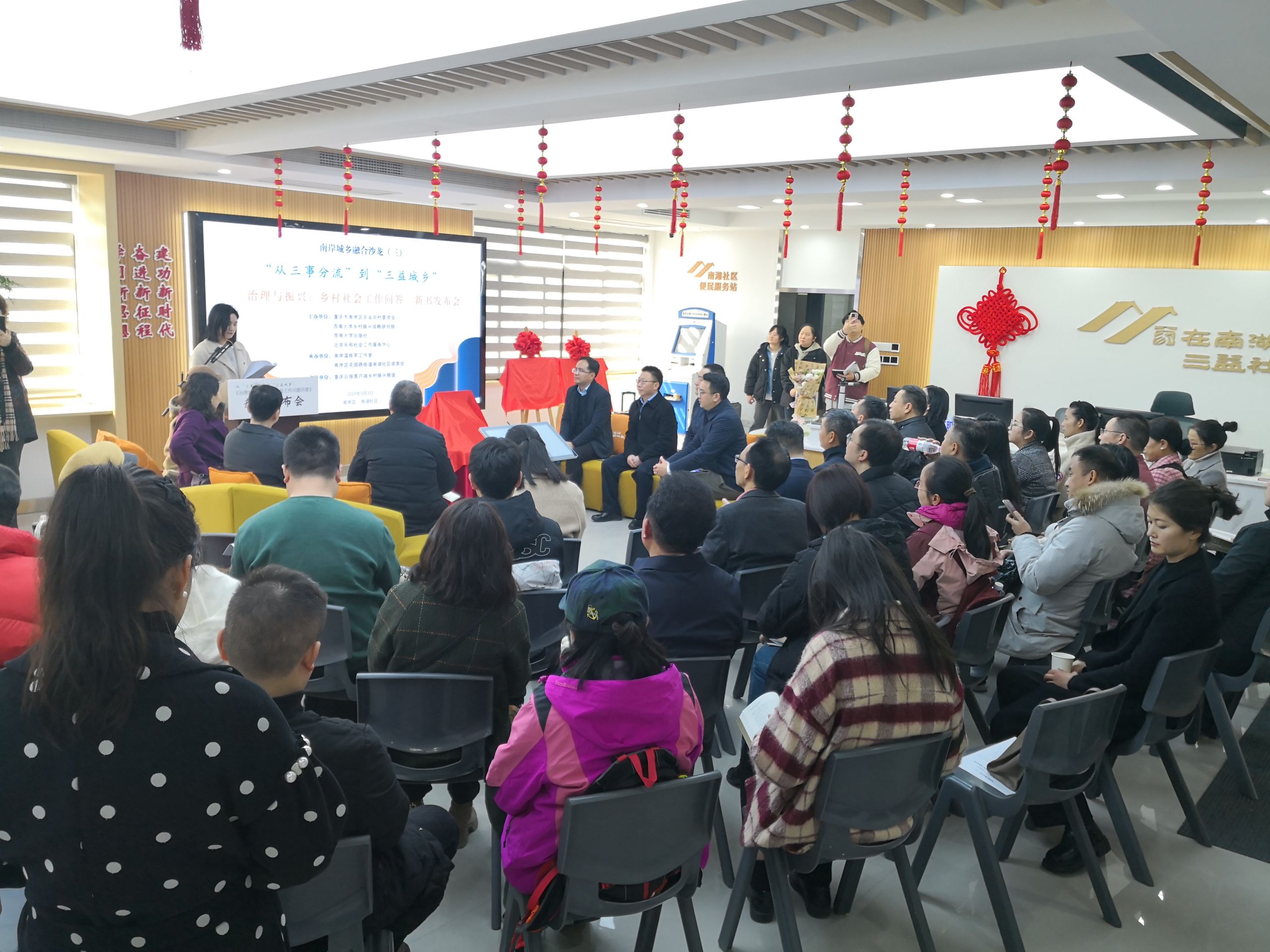 3月3日,由我院与重庆市南岸区农业农村委员会、best365英国在线体育官网出版社、北京乐和社会工作服务中心联合主办的南岸城乡融合沙龙第三期:从“三事分流”到“三益城乡”暨《治理与振兴:乡村社会工作问答》新书发布会,在南岸区花园路街道南湖社区顺利举行。重庆市农委及南岸区政府领导、南岸区相关部门与街镇负责人及来自南岸区多个社区(村)支部书记参加会议。