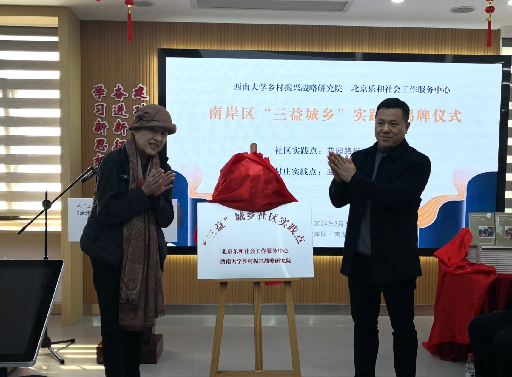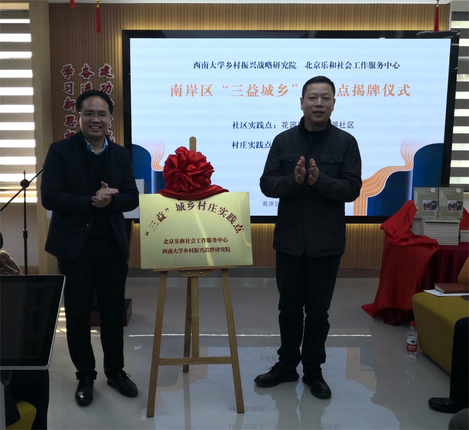 北京乐和社会工作服务中心创始人廖晓义与南岸区花园路街道党工委书记周海军为“三益城乡”南湖社区实践点揭牌