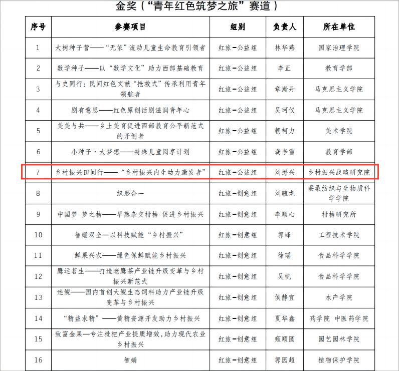 我院指导的“青年红色筑梦之旅”赛道公益组项目《乡村振兴田间行——乡村内生动力激发者》,在校内选拔赛中荣获金奖。该项目由我院副院长潘家恩教授、讲师王彩虹博士、社会服务办公室肖青主任、沐云文旅张俊春董事长共同指导,“大国三农”读书会参与,以乡村为根基,围绕乡村内生动力激发、村民组织、乡村治理等多个方面开展公益活动并进行路演。