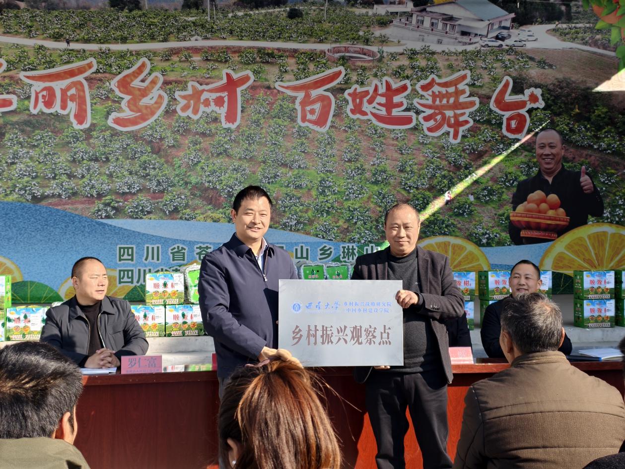 30日下午,调研组前往月山乡琳山村柑橘种植园区,调研柑橘产品质量。在顺源柑橘种植专业合作社举行了best365英国在线体育官网乡村振兴战略研究院首个四川省“乡村振兴观察点”授牌仪式,并与月山乡及琳山村两委、人社局驻村工作队、专业合作社、种植大户座谈,探讨柑橘种植技术及后端销售。