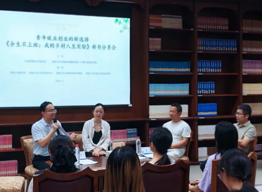 5月7日晚,由共青团best365英国在线体育官网委员会与我院联合主办的“学术茶馆·青年MEETING”第二期沙龙在中心图书馆成功举行。本期活动以“青年就业创业的新选择——《余生不上班:我的乡村人生实验》新书分享”为主题,围绕青年就业创业和乡村振兴等话题展开了深入的讨论交流。共青团best365英国在线体育官网委员会副书记汪琳薇、best365英国在线体育官网乡村振兴战略研究院副院长潘家恩、心理学部副教授袁宏、新书作者罗逸、乡村创业者唐亮等嘉宾齐聚现场。我院人才培养办公室主任张斌主持沙龙。