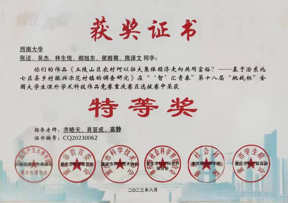 经济管理学院副教授、乡村振兴战略研究院兼职研究员齐皓天,经济管理学院教授、乡村振兴战略研究院执行院长肖亚成、经济管理学院教授、乡村振兴战略研究院兼职研究员高静共同指导的本科生团队作品《丘陵山区农村何以壮大集体经济走向共同富裕?——基于渝东北七区县乡村振兴示范村镇的调查研究》,在2023年6月3日参与第十八届“挑战杯”全国大学生课外学术科技作品竞赛重庆选拔赛决赛中获得特等奖,近日正式颁发了荣誉证书。该作品是三位指导老师以肖亚成教授2022年主持、大家共同参与的重庆市乡村振兴示范村镇中期评估项目所获取的调研资料为基础,指导由经济管理学院农林经济管理专业本科生与西塔学院经济学专业本科生组建的学生团队研究形成的,充分体现了科学研究、社会服务与人才培养的有机融合。