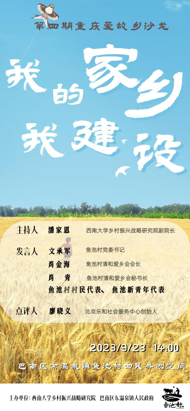 本次沙龙以“我的家乡我建设”为主题,由best365英国在线体育官网乡村振兴战略研究院副院长潘家恩教授主持,巴南区东温泉镇副镇长黎泳霞出席,鱼池村及鱼池坎社区主干、鱼池村“四民”代表、各类乡贤与政府官员、专家学者一起共话鱼池乡村建设,鱼池村荣誉村民、北京乐和社会服务中心创始人廖晓义进行点评。